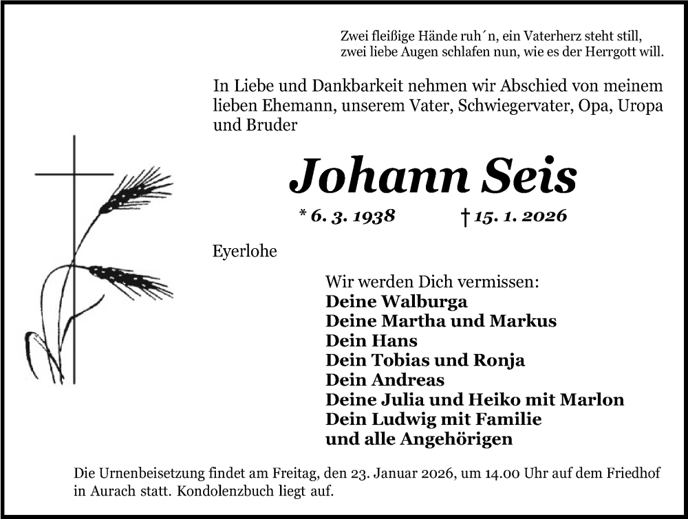 Hier finden Sie alle Traueranzeigen aus der Zeitung, die bisher für Johann Seis erschienen sind. Weitere Traueranzeigen, die in der Zeitung erscheinen, werden hier ebenfalls aufgelistet