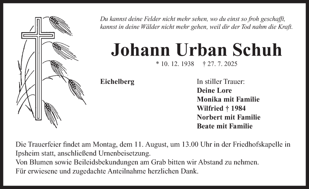 Hier finden Sie alle Traueranzeigen aus der Zeitung, die bisher für Johann Urban Schuh erschienen sind. Weitere Traueranzeigen, die in der Zeitung erscheinen, werden hier ebenfalls aufgelistet