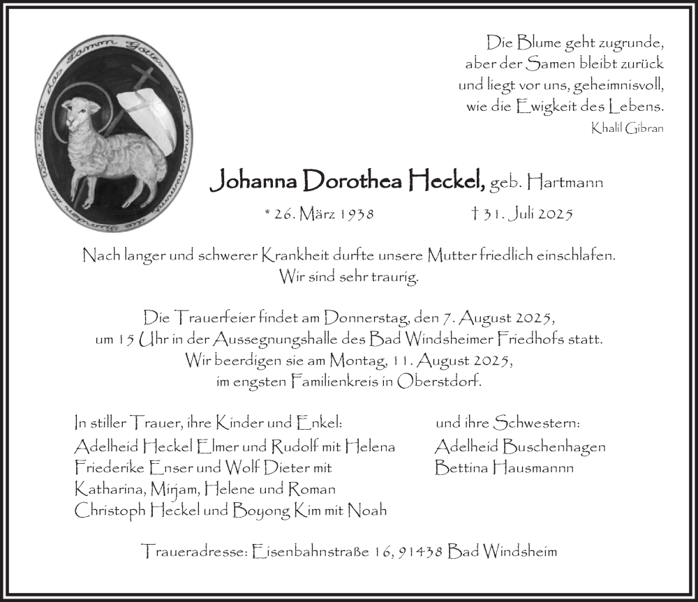 Hier finden Sie alle Traueranzeigen aus der Zeitung, die bisher für Johanna Dorothea Heckel erschienen sind. Weitere Traueranzeigen, die in der Zeitung erscheinen, werden hier ebenfalls aufgelistet