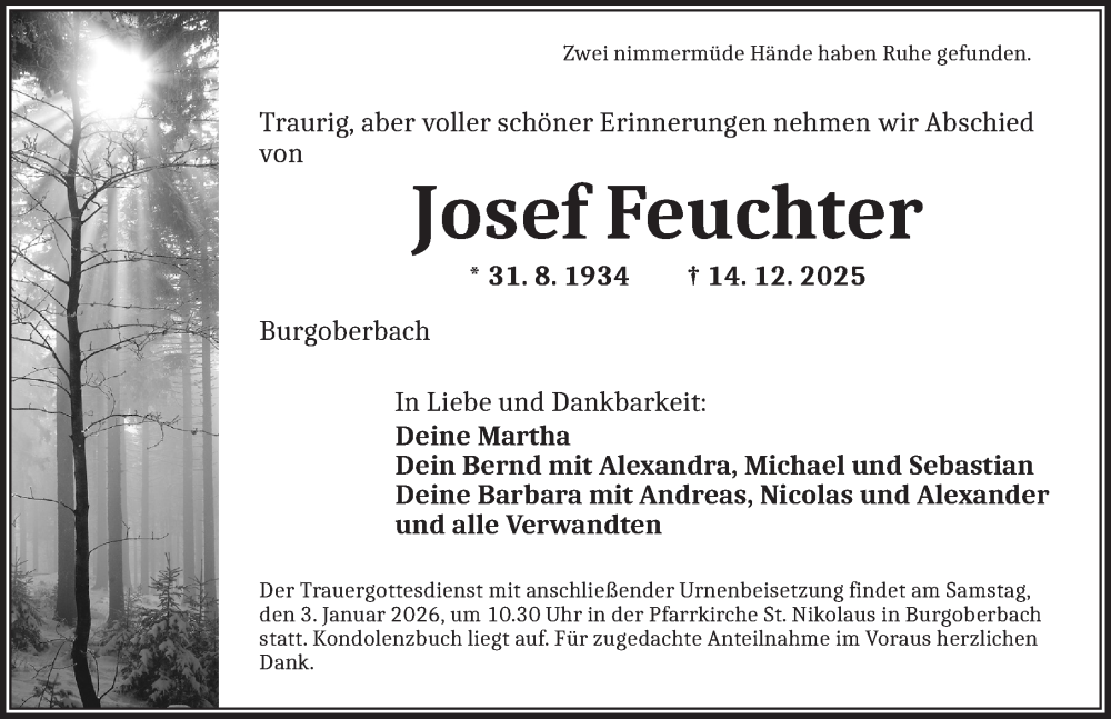 Hier finden Sie alle Traueranzeigen aus der Zeitung, die bisher für Josef Feuchter erschienen sind. Weitere Traueranzeigen, die in der Zeitung erscheinen, werden hier ebenfalls aufgelistet