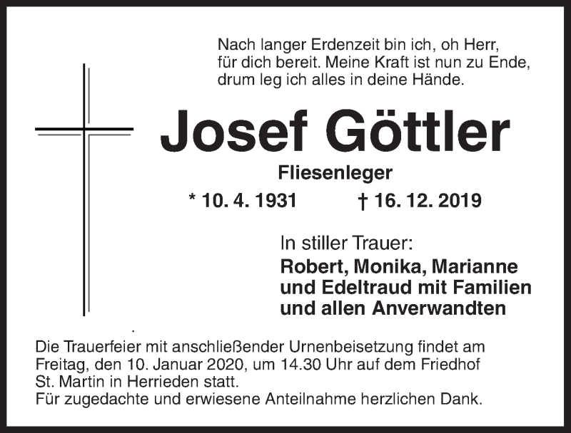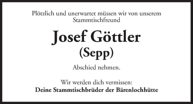 Hier finden Sie alle Traueranzeigen aus der Zeitung, die bisher für Josef Göttler erschienen sind. Weitere Traueranzeigen, die in der Zeitung erscheinen, werden hier ebenfalls aufgelistet