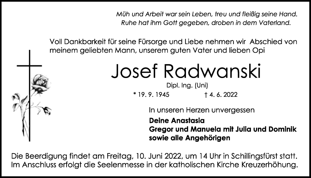 Hier finden Sie alle Traueranzeigen aus der Zeitung, die bisher für Josef Radwanski erschienen sind. Weitere Traueranzeigen, die in der Zeitung erscheinen, werden hier ebenfalls aufgelistet