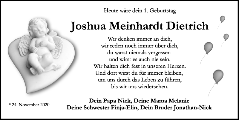 Hier finden Sie alle Traueranzeigen aus der Zeitung, die bisher für Joshua Meinhardt Dietrich erschienen sind. Weitere Traueranzeigen, die in der Zeitung erscheinen, werden hier ebenfalls aufgelistet