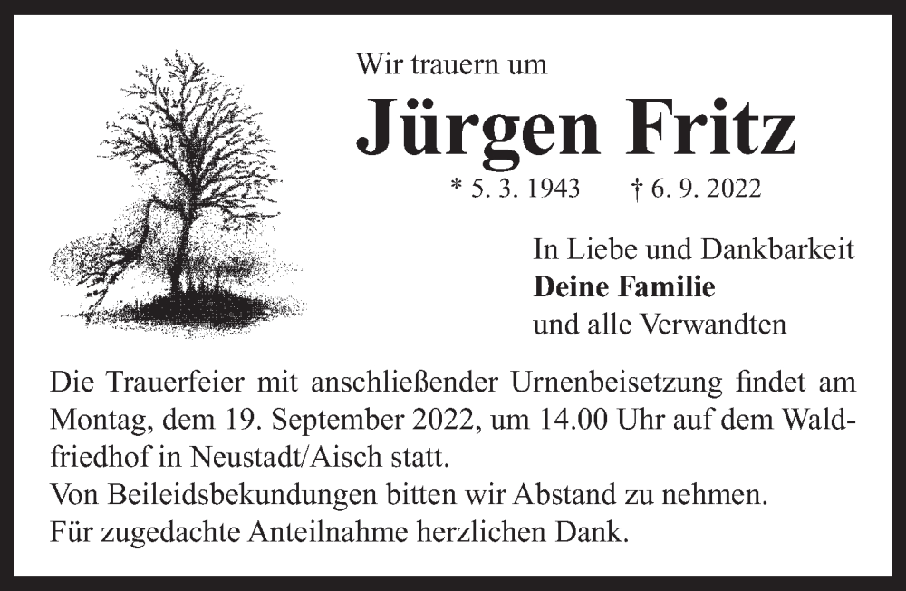 Hier finden Sie alle Traueranzeigen aus der Zeitung, die bisher für Jürgen Fritz erschienen sind. Weitere Traueranzeigen, die in der Zeitung erscheinen, werden hier ebenfalls aufgelistet