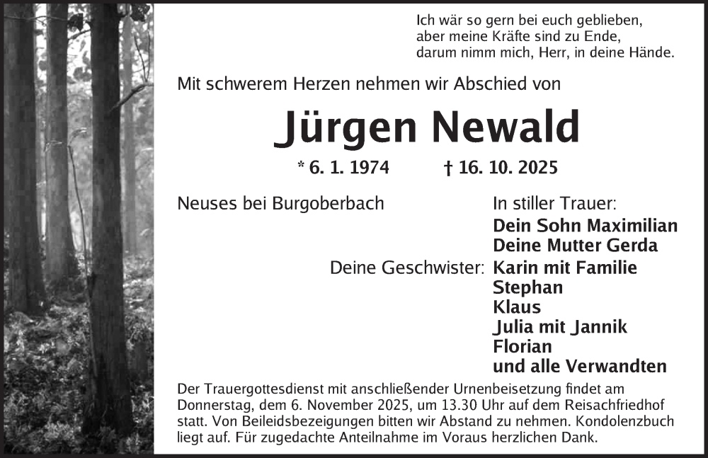 Hier finden Sie alle Traueranzeigen aus der Zeitung, die bisher für Jürgen Newald erschienen sind. Weitere Traueranzeigen, die in der Zeitung erscheinen, werden hier ebenfalls aufgelistet
