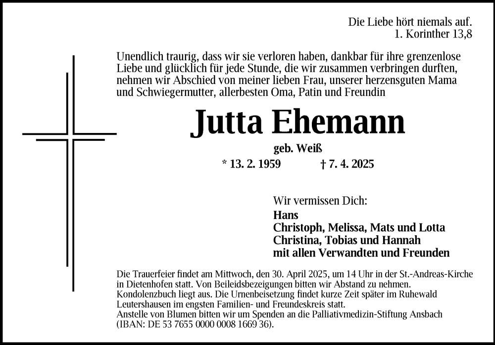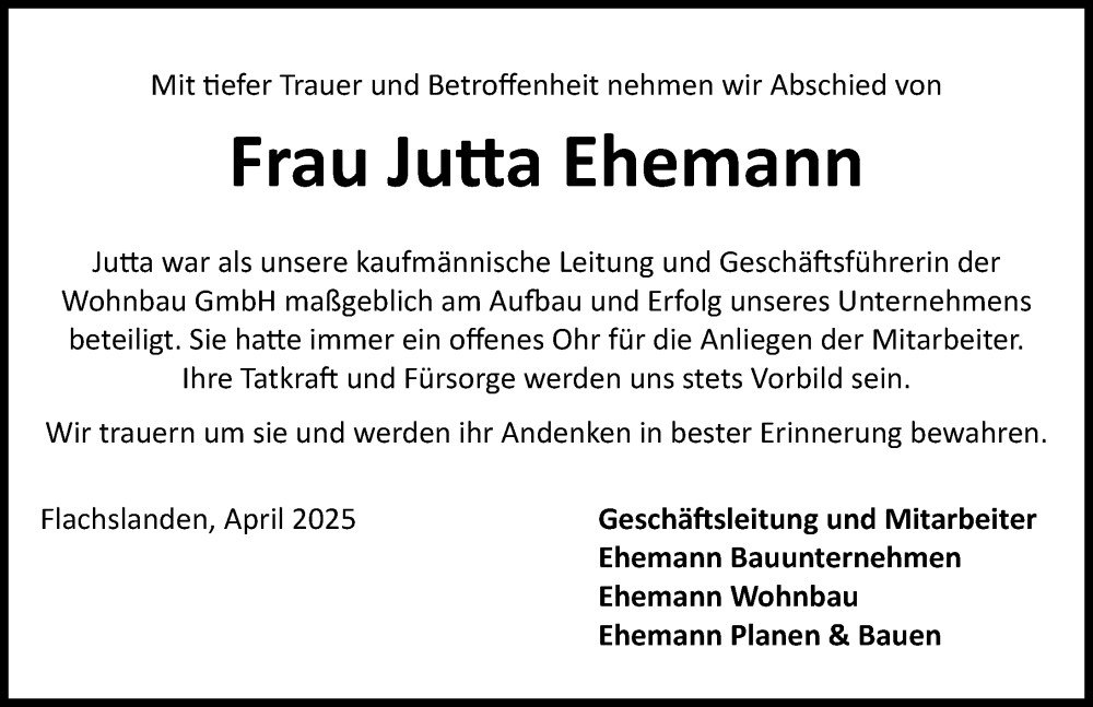Hier finden Sie alle Traueranzeigen aus der Zeitung, die bisher für Jutta Ehemann erschienen sind. Weitere Traueranzeigen, die in der Zeitung erscheinen, werden hier ebenfalls aufgelistet
