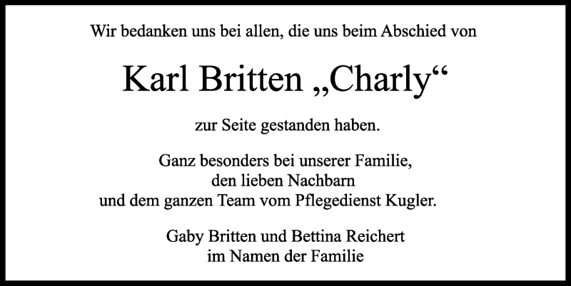 Hier finden Sie alle Traueranzeigen aus der Zeitung, die bisher für Karl Britten erschienen sind. Weitere Traueranzeigen, die in der Zeitung erscheinen, werden hier ebenfalls aufgelistet