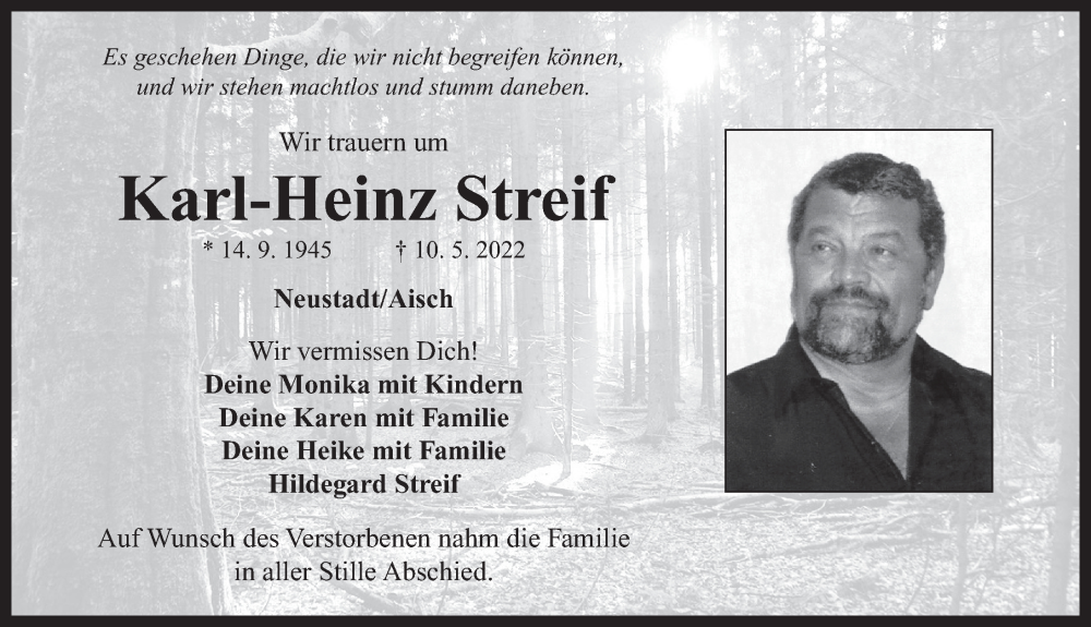 Hier finden Sie alle Traueranzeigen aus der Zeitung, die bisher für Karl-Heinz Streif erschienen sind. Weitere Traueranzeigen, die in der Zeitung erscheinen, werden hier ebenfalls aufgelistet