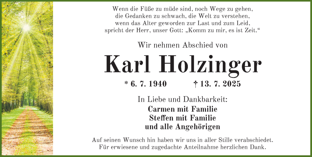Hier finden Sie alle Traueranzeigen aus der Zeitung, die bisher für Karl Holzinger erschienen sind. Weitere Traueranzeigen, die in der Zeitung erscheinen, werden hier ebenfalls aufgelistet