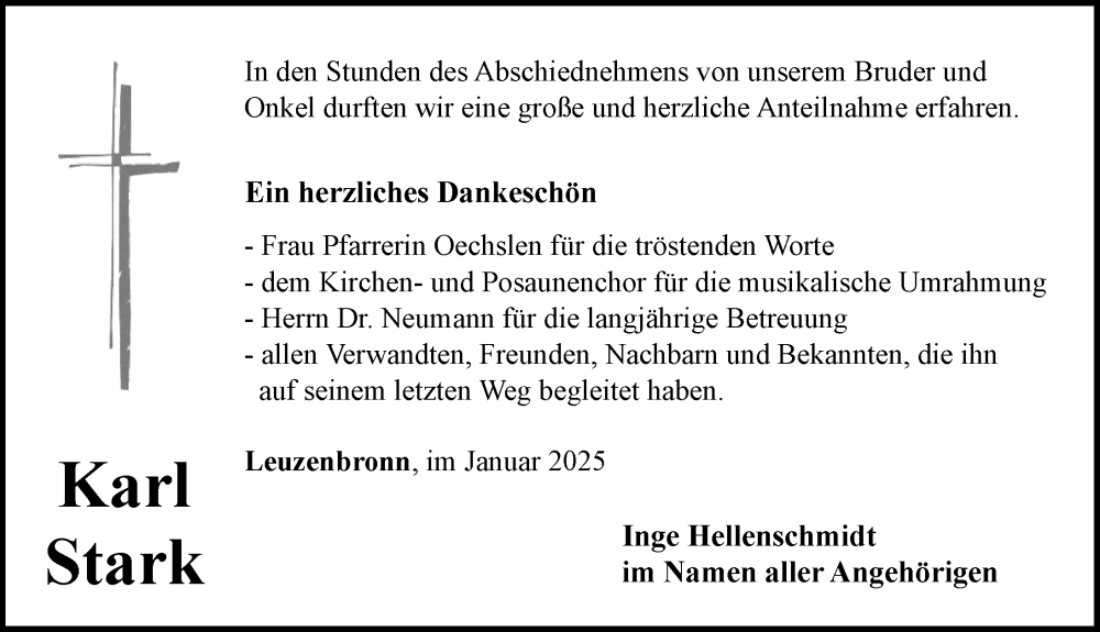 Hier finden Sie alle Traueranzeigen aus der Zeitung, die bisher für Karl Stark erschienen sind. Weitere Traueranzeigen, die in der Zeitung erscheinen, werden hier ebenfalls aufgelistet