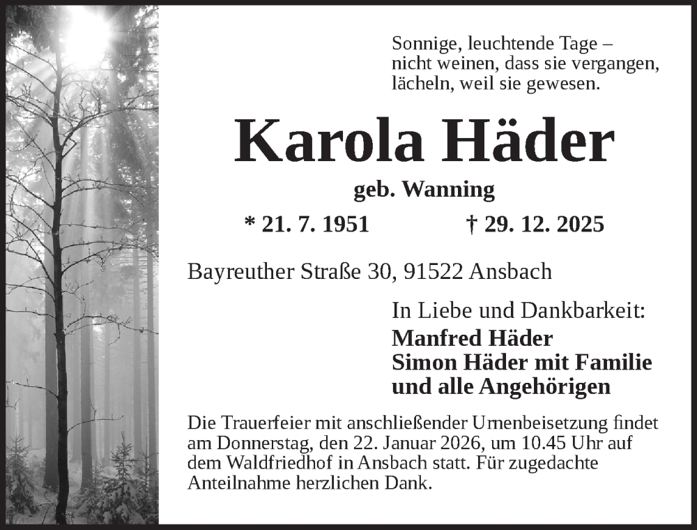 Hier finden Sie alle Traueranzeigen aus der Zeitung, die bisher für Karola Häder erschienen sind. Weitere Traueranzeigen, die in der Zeitung erscheinen, werden hier ebenfalls aufgelistet