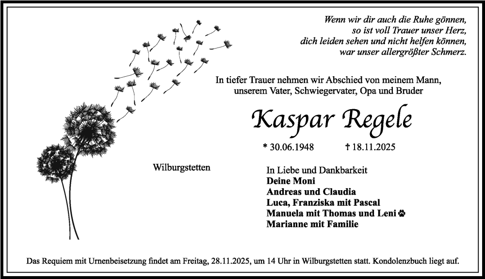 Hier finden Sie alle Traueranzeigen aus der Zeitung, die bisher für Kaspar Regele erschienen sind. Weitere Traueranzeigen, die in der Zeitung erscheinen, werden hier ebenfalls aufgelistet