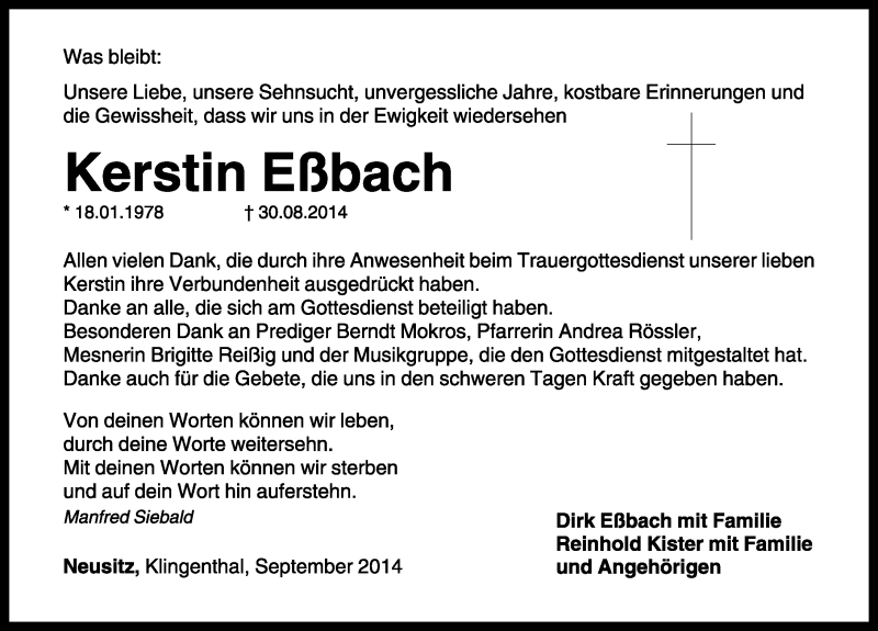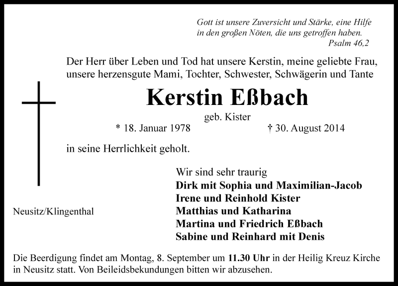 Hier finden Sie alle Traueranzeigen aus der Zeitung, die bisher für Kerstin Eßbach erschienen sind. Weitere Traueranzeigen, die in der Zeitung erscheinen, werden hier ebenfalls aufgelistet