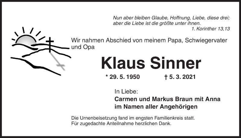 Hier finden Sie alle Traueranzeigen aus der Zeitung, die bisher für Klaus Sinner erschienen sind. Weitere Traueranzeigen, die in der Zeitung erscheinen, werden hier ebenfalls aufgelistet
