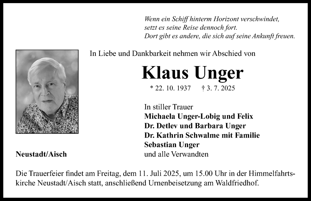 Hier finden Sie alle Traueranzeigen aus der Zeitung, die bisher für Klaus Unger erschienen sind. Weitere Traueranzeigen, die in der Zeitung erscheinen, werden hier ebenfalls aufgelistet