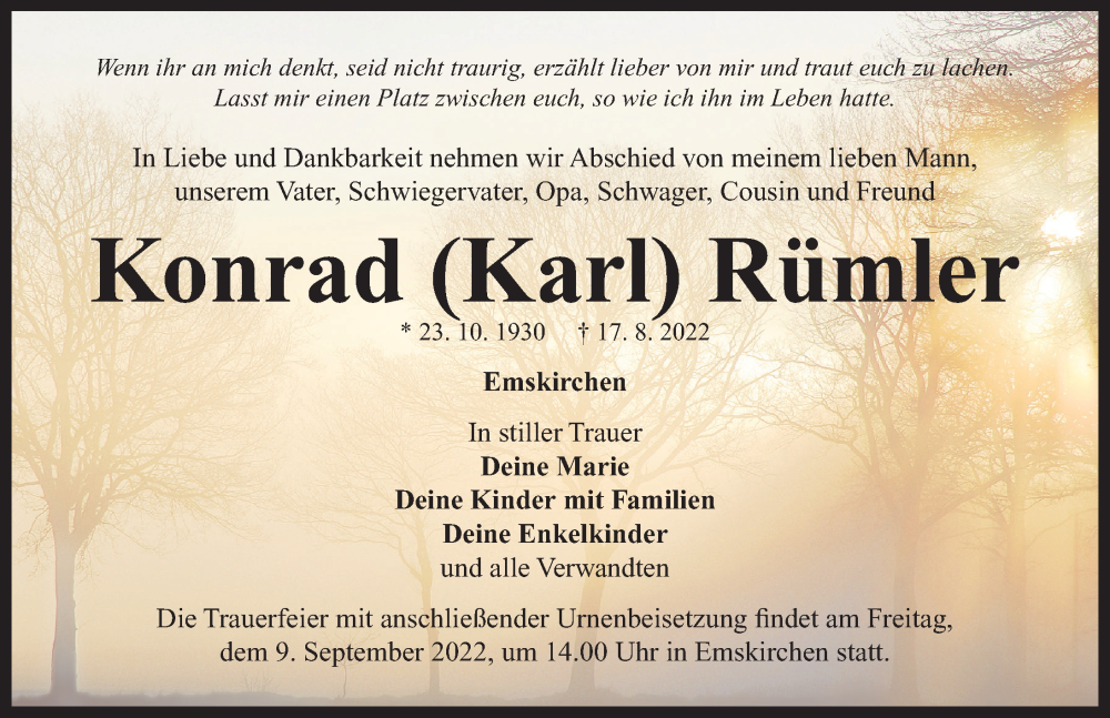 Hier finden Sie alle Traueranzeigen aus der Zeitung, die bisher für Konrad Rümler erschienen sind. Weitere Traueranzeigen, die in der Zeitung erscheinen, werden hier ebenfalls aufgelistet