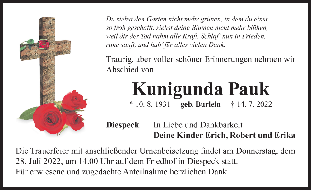 Hier finden Sie alle Traueranzeigen aus der Zeitung, die bisher für Kunigunda Pauk erschienen sind. Weitere Traueranzeigen, die in der Zeitung erscheinen, werden hier ebenfalls aufgelistet