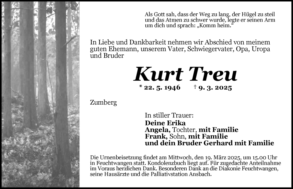 Hier finden Sie alle Traueranzeigen aus der Zeitung, die bisher für Kurt Treu erschienen sind. Weitere Traueranzeigen, die in der Zeitung erscheinen, werden hier ebenfalls aufgelistet