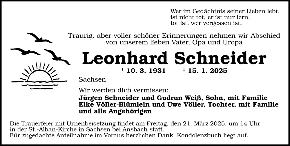 Hier finden Sie alle Traueranzeigen aus der Zeitung, die bisher für Leonhard Schneider erschienen sind. Weitere Traueranzeigen, die in der Zeitung erscheinen, werden hier ebenfalls aufgelistet