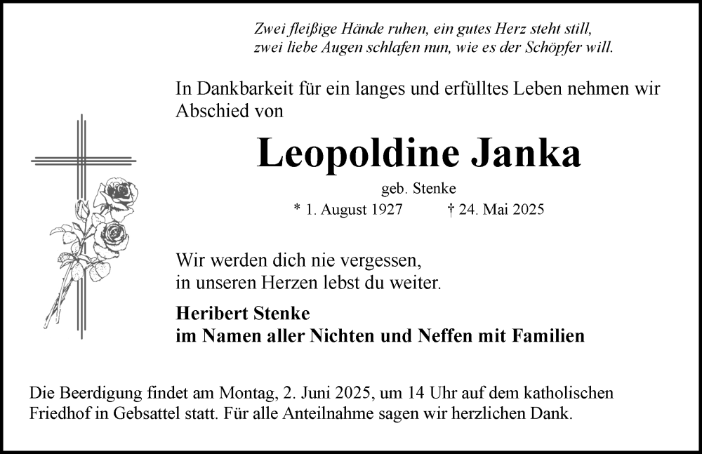 Hier finden Sie alle Traueranzeigen aus der Zeitung, die bisher für Leopoldine Janka erschienen sind. Weitere Traueranzeigen, die in der Zeitung erscheinen, werden hier ebenfalls aufgelistet