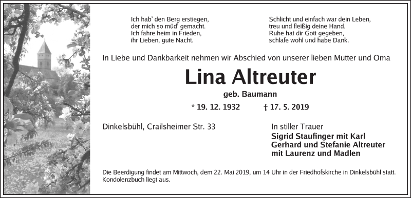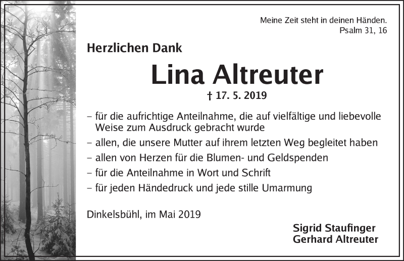 Hier finden Sie alle Traueranzeigen aus der Zeitung, die bisher für Lina Altreuter erschienen sind. Weitere Traueranzeigen, die in der Zeitung erscheinen, werden hier ebenfalls aufgelistet