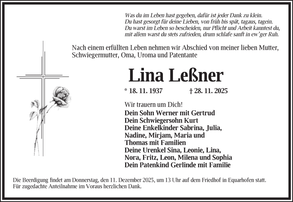 Hier finden Sie alle Traueranzeigen aus der Zeitung, die bisher für Lina Leßner erschienen sind. Weitere Traueranzeigen, die in der Zeitung erscheinen, werden hier ebenfalls aufgelistet