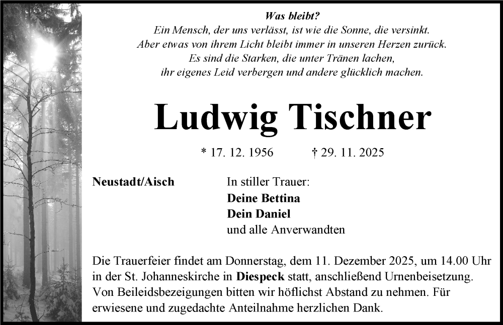 Hier finden Sie alle Traueranzeigen aus der Zeitung, die bisher für Ludwig Tischner erschienen sind. Weitere Traueranzeigen, die in der Zeitung erscheinen, werden hier ebenfalls aufgelistet