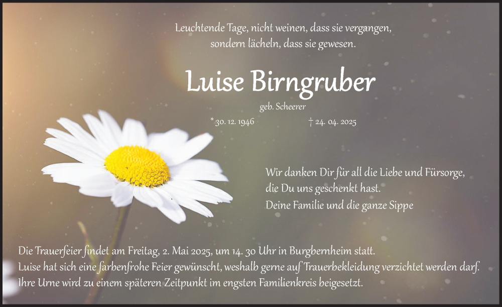 Hier finden Sie alle Traueranzeigen aus der Zeitung, die bisher für Luise Birngruber erschienen sind. Weitere Traueranzeigen, die in der Zeitung erscheinen, werden hier ebenfalls aufgelistet