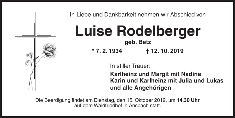 Hier finden Sie alle Traueranzeigen aus der Zeitung, die bisher für Luise Rodelberger erschienen sind. Weitere Traueranzeigen, die in der Zeitung erscheinen, werden hier ebenfalls aufgelistet