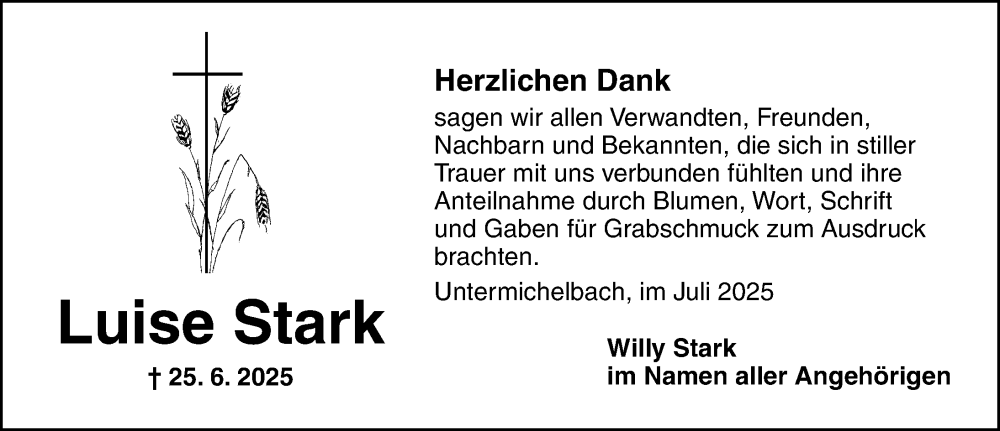 Hier finden Sie alle Traueranzeigen aus der Zeitung, die bisher für Luise Stark erschienen sind. Weitere Traueranzeigen, die in der Zeitung erscheinen, werden hier ebenfalls aufgelistet