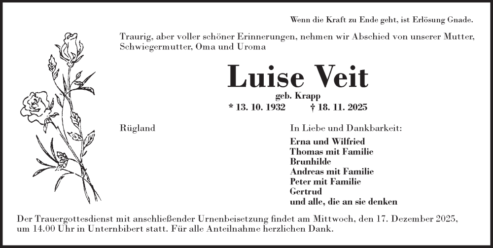 Hier finden Sie alle Traueranzeigen aus der Zeitung, die bisher für Luise Veit erschienen sind. Weitere Traueranzeigen, die in der Zeitung erscheinen, werden hier ebenfalls aufgelistet