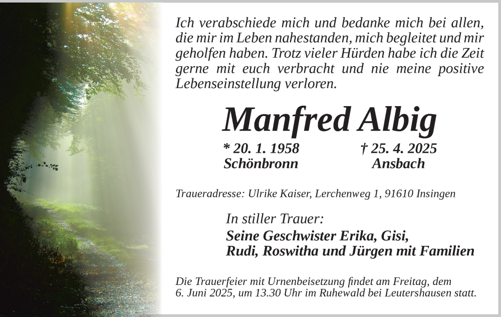 Hier finden Sie alle Traueranzeigen aus der Zeitung, die bisher für Manfred Albig erschienen sind. Weitere Traueranzeigen, die in der Zeitung erscheinen, werden hier ebenfalls aufgelistet