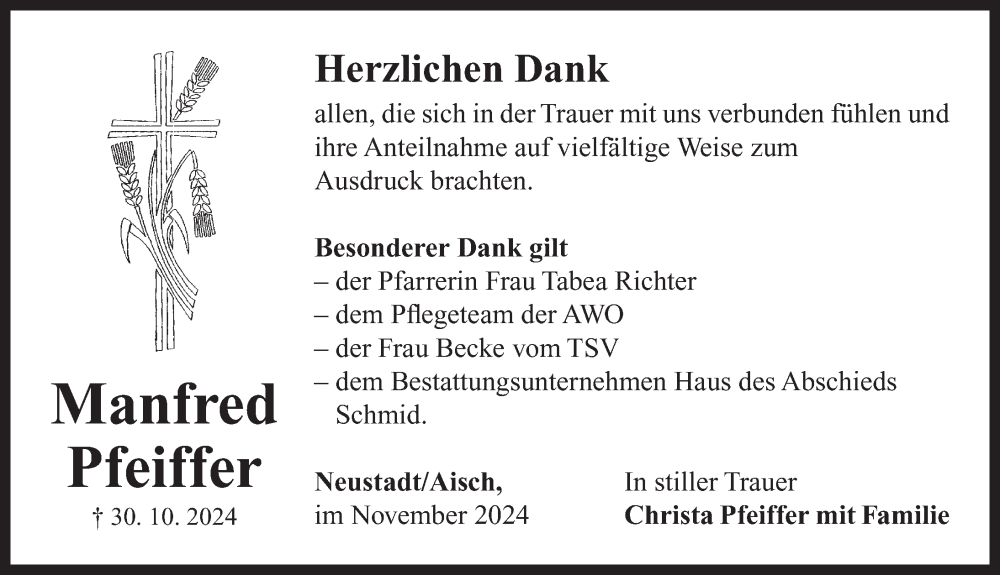 Hier finden Sie alle Traueranzeigen aus der Zeitung, die bisher für Manfred Pfeiffer erschienen sind. Weitere Traueranzeigen, die in der Zeitung erscheinen, werden hier ebenfalls aufgelistet