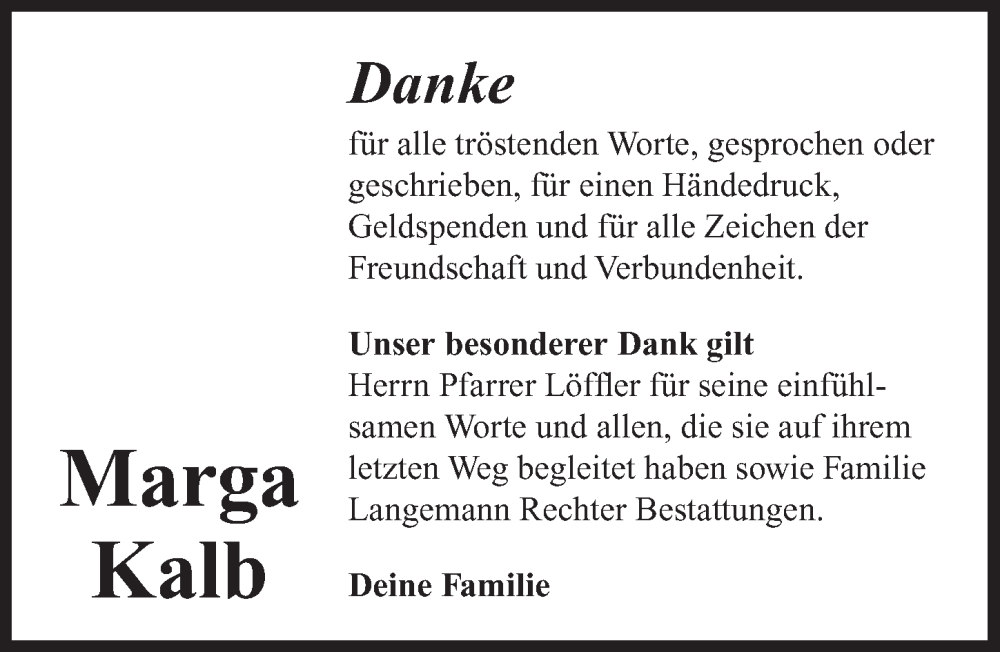 Hier finden Sie alle Traueranzeigen aus der Zeitung, die bisher für Marga Kalb erschienen sind. Weitere Traueranzeigen, die in der Zeitung erscheinen, werden hier ebenfalls aufgelistet