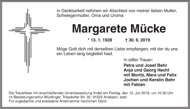 Hier finden Sie alle Traueranzeigen aus der Zeitung, die bisher für Margarete Mücke erschienen sind. Weitere Traueranzeigen, die in der Zeitung erscheinen, werden hier ebenfalls aufgelistet