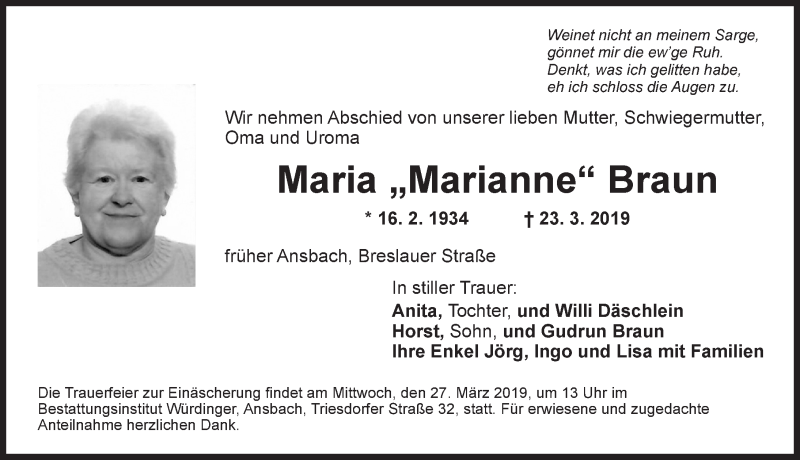 Hier finden Sie alle Traueranzeigen aus der Zeitung, die bisher für Maria Braun erschienen sind. Weitere Traueranzeigen, die in der Zeitung erscheinen, werden hier ebenfalls aufgelistet