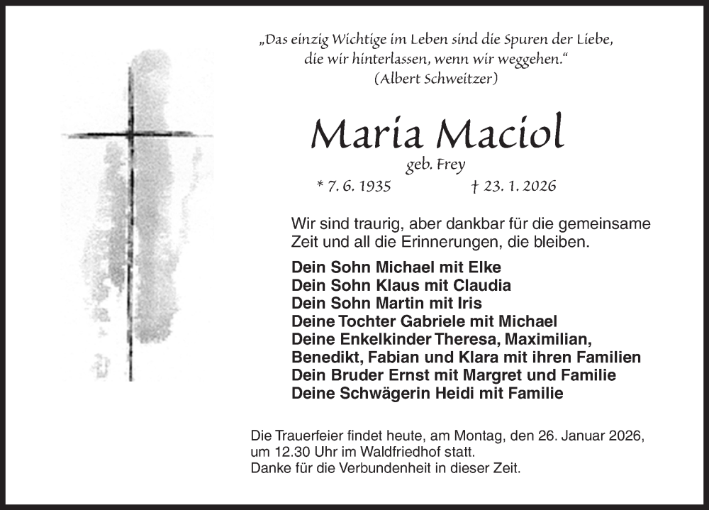 Hier finden Sie alle Traueranzeigen aus der Zeitung, die bisher für Maria Maciol erschienen sind. Weitere Traueranzeigen, die in der Zeitung erscheinen, werden hier ebenfalls aufgelistet
