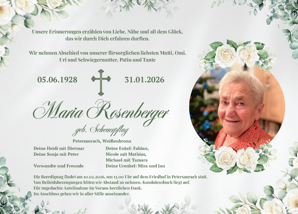 Hier finden Sie alle Traueranzeigen aus der Zeitung, die bisher für Maria Rosenberger erschienen sind. Weitere Traueranzeigen, die in der Zeitung erscheinen, werden hier ebenfalls aufgelistet
