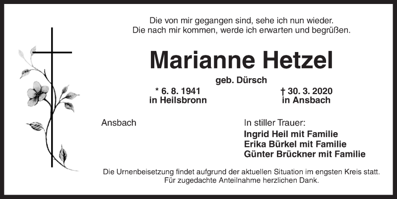 Hier finden Sie alle Traueranzeigen aus der Zeitung, die bisher für Marianne Hetzel erschienen sind. Weitere Traueranzeigen, die in der Zeitung erscheinen, werden hier ebenfalls aufgelistet