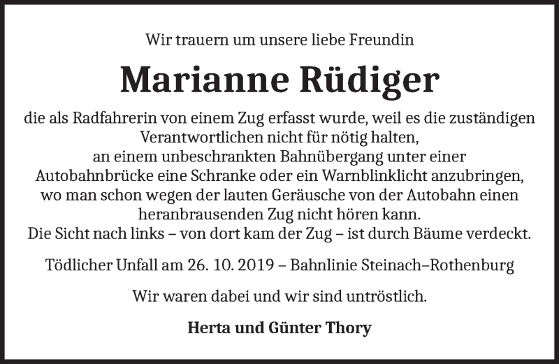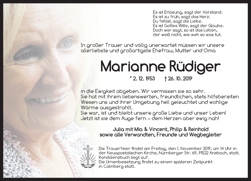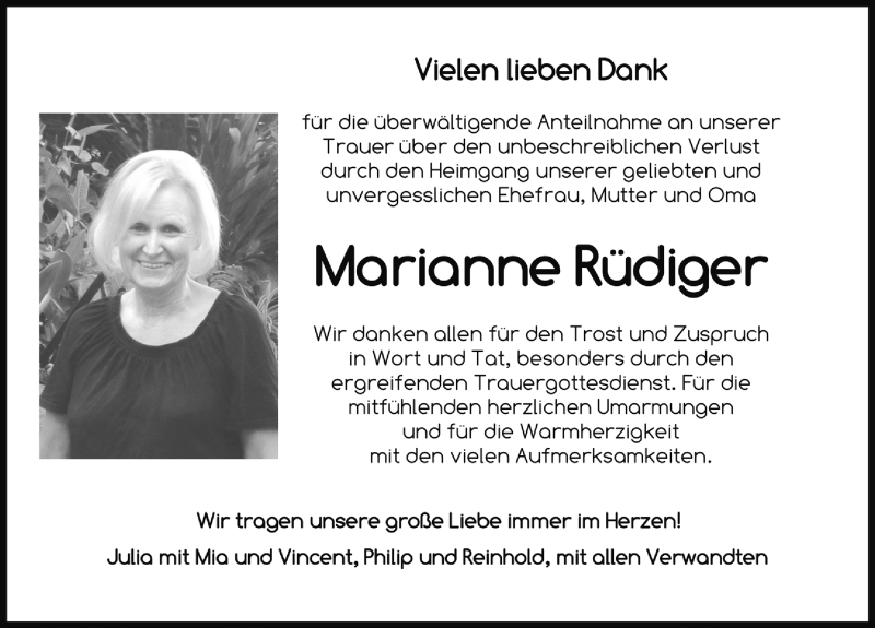 Hier finden Sie alle Traueranzeigen aus der Zeitung, die bisher für Marianne Rüdiger erschienen sind. Weitere Traueranzeigen, die in der Zeitung erscheinen, werden hier ebenfalls aufgelistet
