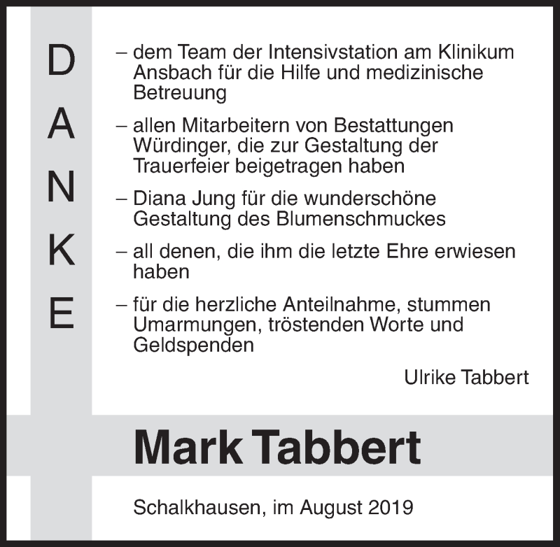 Hier finden Sie alle Traueranzeigen aus der Zeitung, die bisher für Mark Tabbert erschienen sind. Weitere Traueranzeigen, die in der Zeitung erscheinen, werden hier ebenfalls aufgelistet