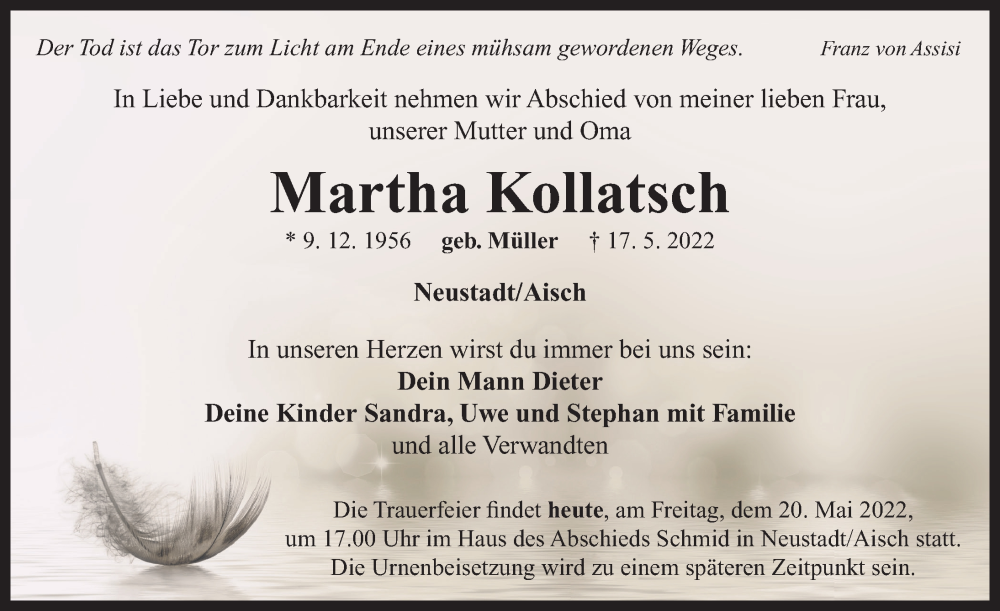 Hier finden Sie alle Traueranzeigen aus der Zeitung, die bisher für Martha Kollatsch erschienen sind. Weitere Traueranzeigen, die in der Zeitung erscheinen, werden hier ebenfalls aufgelistet