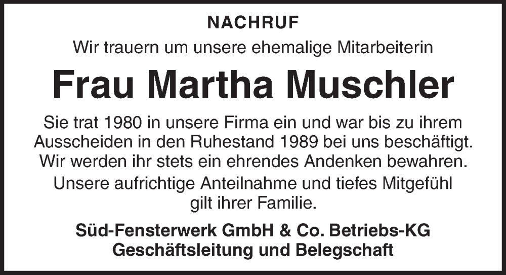 Hier finden Sie alle Traueranzeigen aus der Zeitung, die bisher für Martha Muschler erschienen sind. Weitere Traueranzeigen, die in der Zeitung erscheinen, werden hier ebenfalls aufgelistet