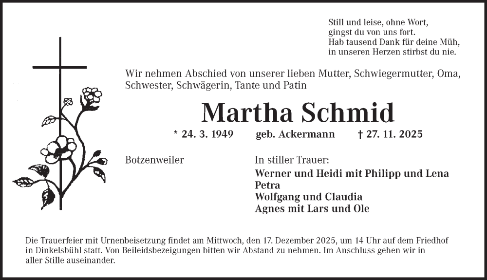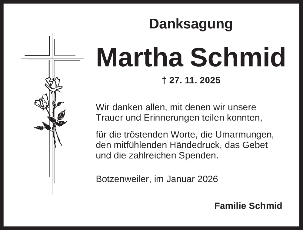 Hier finden Sie alle Traueranzeigen aus der Zeitung, die bisher für Martha Schmid erschienen sind. Weitere Traueranzeigen, die in der Zeitung erscheinen, werden hier ebenfalls aufgelistet