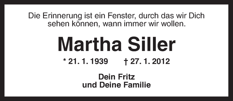 Hier finden Sie alle Traueranzeigen aus der Zeitung, die bisher für Martha Silier erschienen sind. Weitere Traueranzeigen, die in der Zeitung erscheinen, werden hier ebenfalls aufgelistet