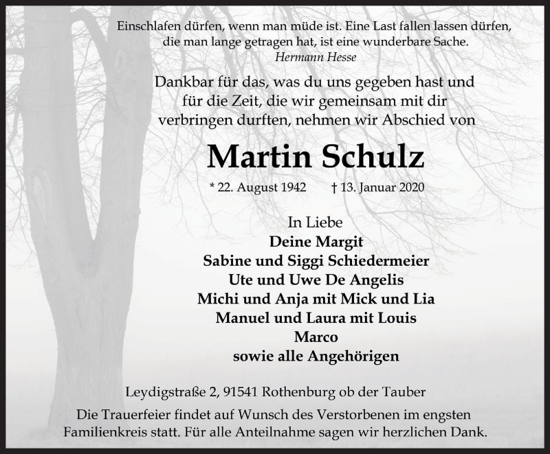 Hier finden Sie alle Traueranzeigen aus der Zeitung, die bisher für Martin Schulz erschienen sind. Weitere Traueranzeigen, die in der Zeitung erscheinen, werden hier ebenfalls aufgelistet