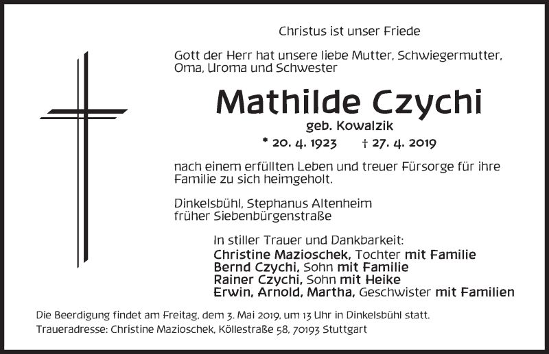 Hier finden Sie alle Traueranzeigen aus der Zeitung, die bisher für Mathilde Czychi erschienen sind. Weitere Traueranzeigen, die in der Zeitung erscheinen, werden hier ebenfalls aufgelistet