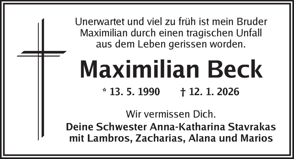 Hier finden Sie alle Traueranzeigen aus der Zeitung, die bisher für Maximilian Beck erschienen sind. Weitere Traueranzeigen, die in der Zeitung erscheinen, werden hier ebenfalls aufgelistet