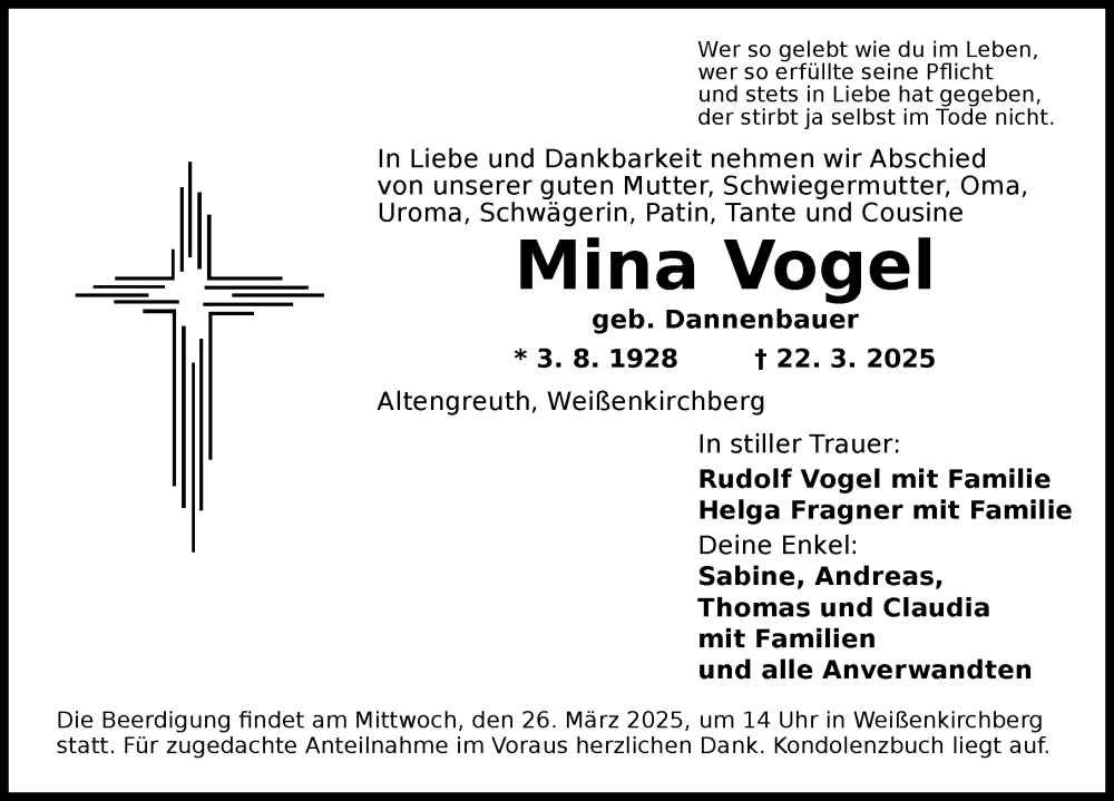 Hier finden Sie alle Traueranzeigen aus der Zeitung, die bisher für Mina Vogel erschienen sind. Weitere Traueranzeigen, die in der Zeitung erscheinen, werden hier ebenfalls aufgelistet