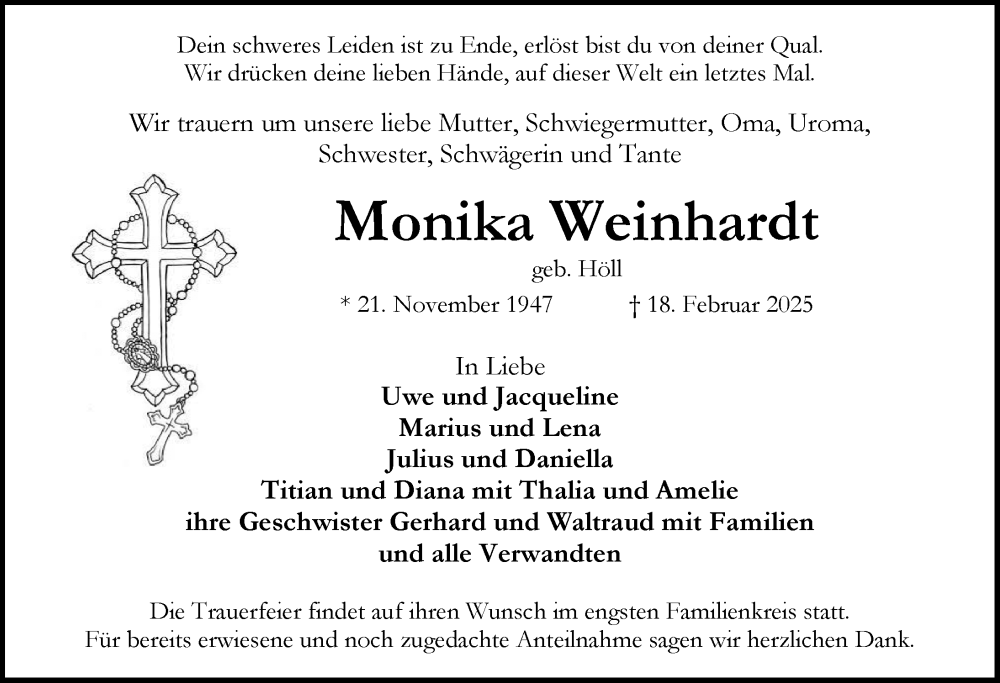 Hier finden Sie alle Traueranzeigen aus der Zeitung, die bisher für Monika Weinhardt erschienen sind. Weitere Traueranzeigen, die in der Zeitung erscheinen, werden hier ebenfalls aufgelistet